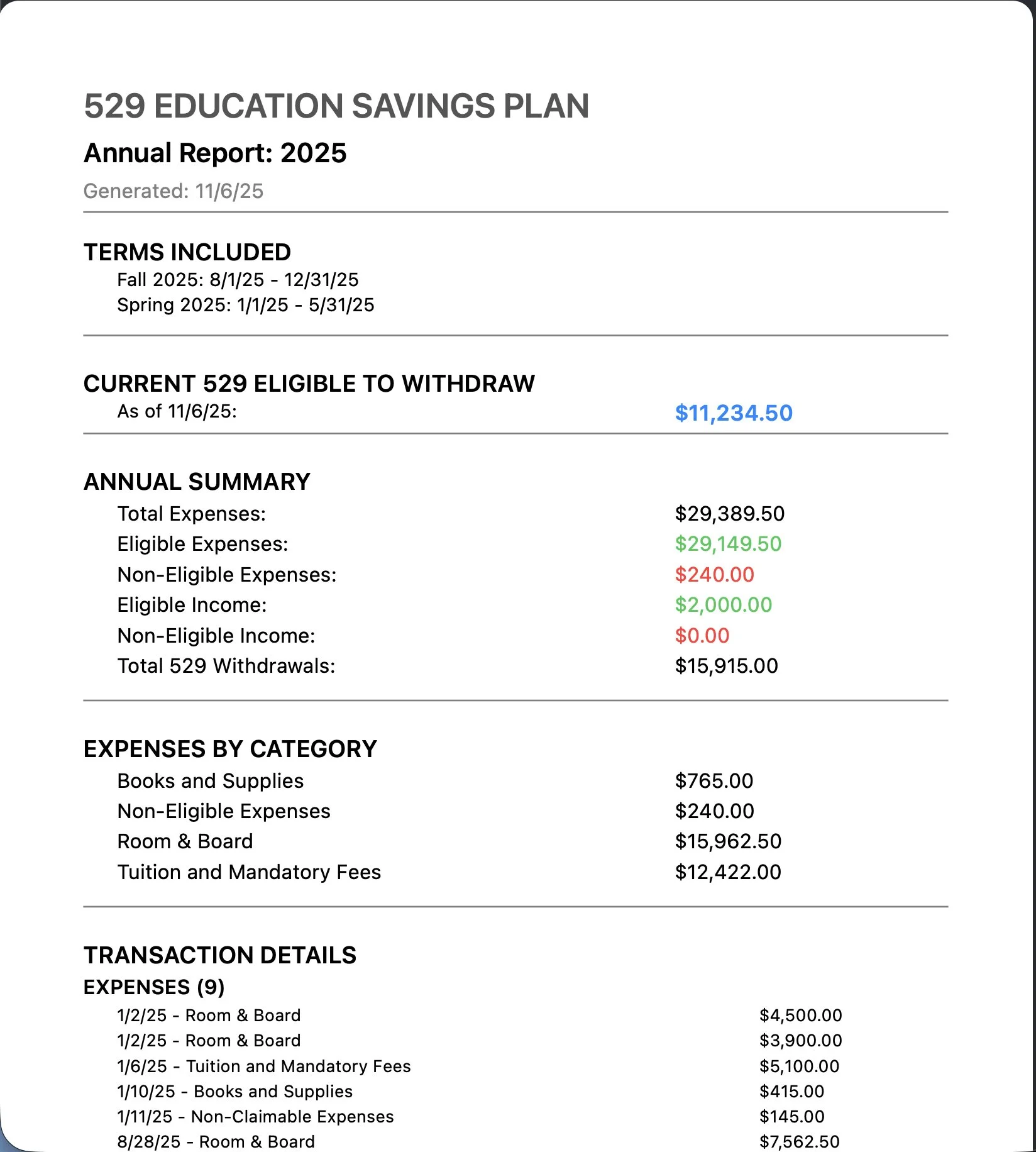 It's the stress-free way to handle 529 funds and prepare your IRS required documentation. Print or export a .pdf or .csv report whenever you want. Your accountant will love you for it!